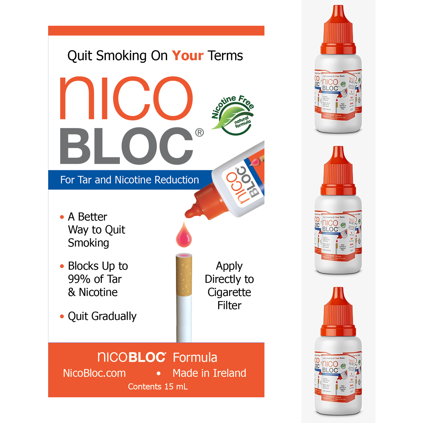 NICOBLOC is the only product that blocks up to 99% of tar and nicotine. It is made from natural ingredients and is drug free. It is applied to the filter just prior to smoking and absorbed into the filter.